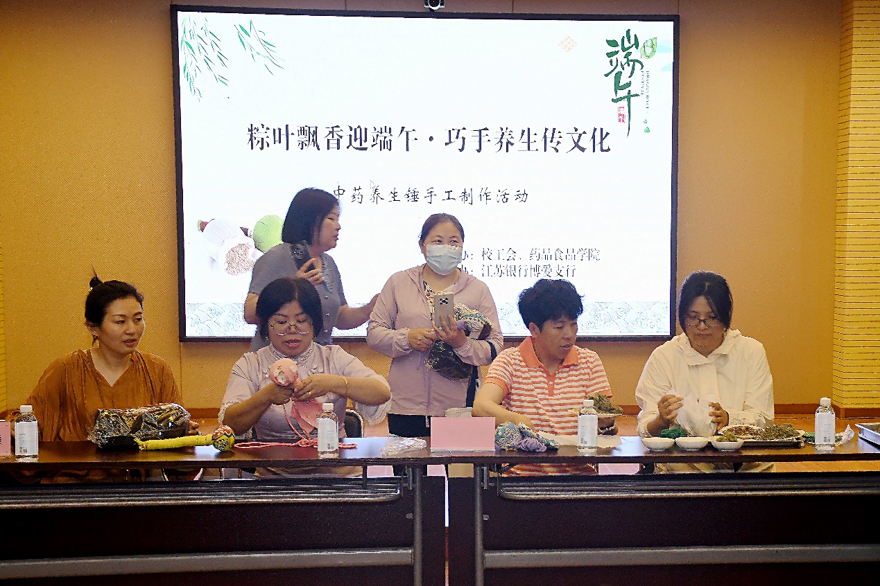 为深入弘扬中华优秀传统文化,积极倡导健康养生理念,丰富教职工精神文化生活,5月29日下午,校工会联合药品食品学院携手江苏银行举办了“粽叶飘香迎端午 巧手养生传文化”中药养生锤手工制作主题活动,五十余名教职工齐聚一堂,共赴一场融合传统文化与现代生活的端午之约。